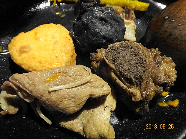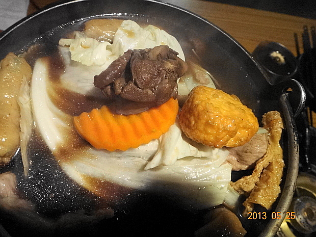 ↓煮好的竹炭丸、心型丸子、豬肉片、藥膳排骨