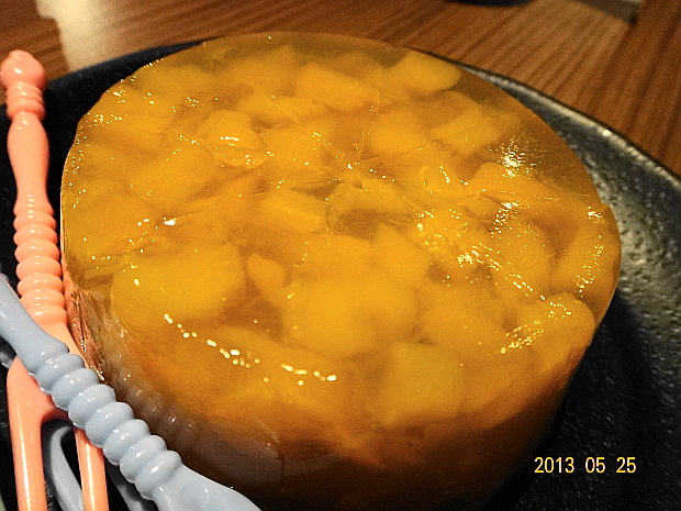 直到服務人員端上桌,我們才恍然大悟:原來是加入蒟蒻做成的芒果果凍,名稱就是“台灣纖果”呀!