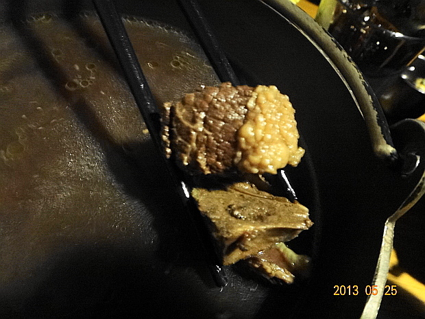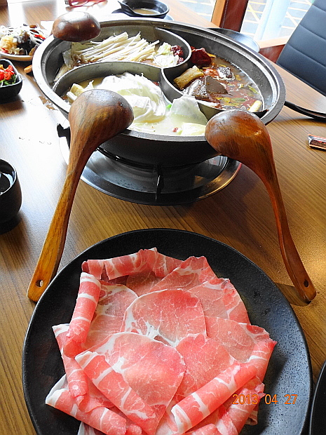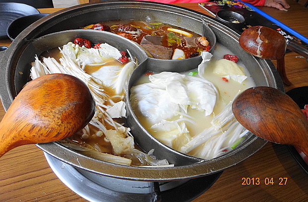 接著送上和上次同樣那麼大一鍋的”麻辣賓士鍋”,有極品麻辣湯底(上),御膳養生湯底(左),美人白湯底(右)。
